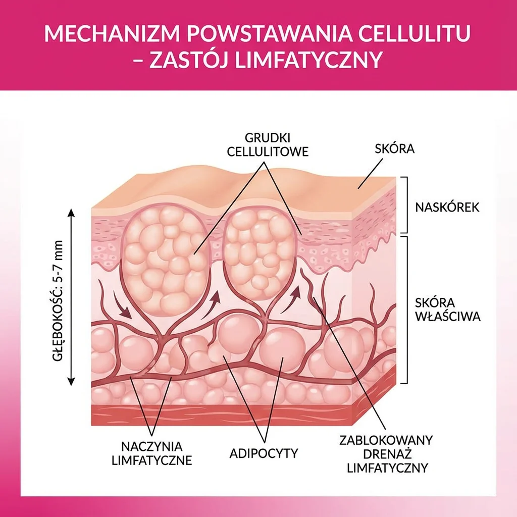 Różnica? Dociera 5-7mm w głąb skóry – bezpośrednio do warstwy limfatycznej, gdzie znajduje się prawdziwa przyczyna cellulitu.